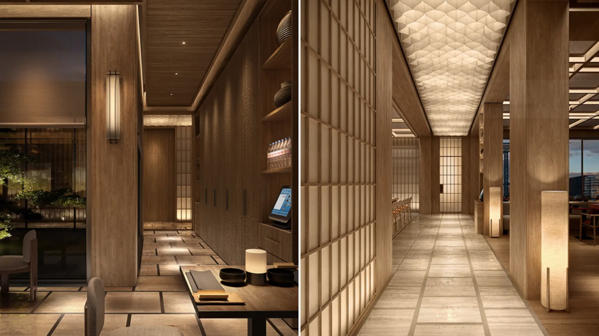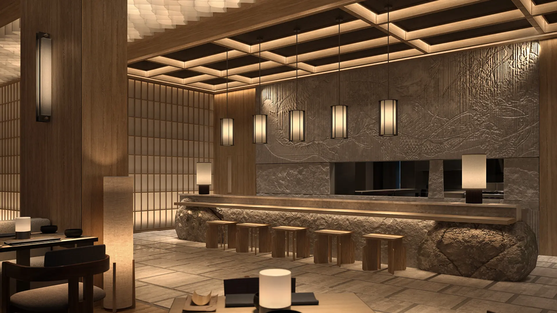 Không gian nhà hàng Nhật Bản với tone màu xám ghi, nâu gỗ kết hợp đèn vàng ấm