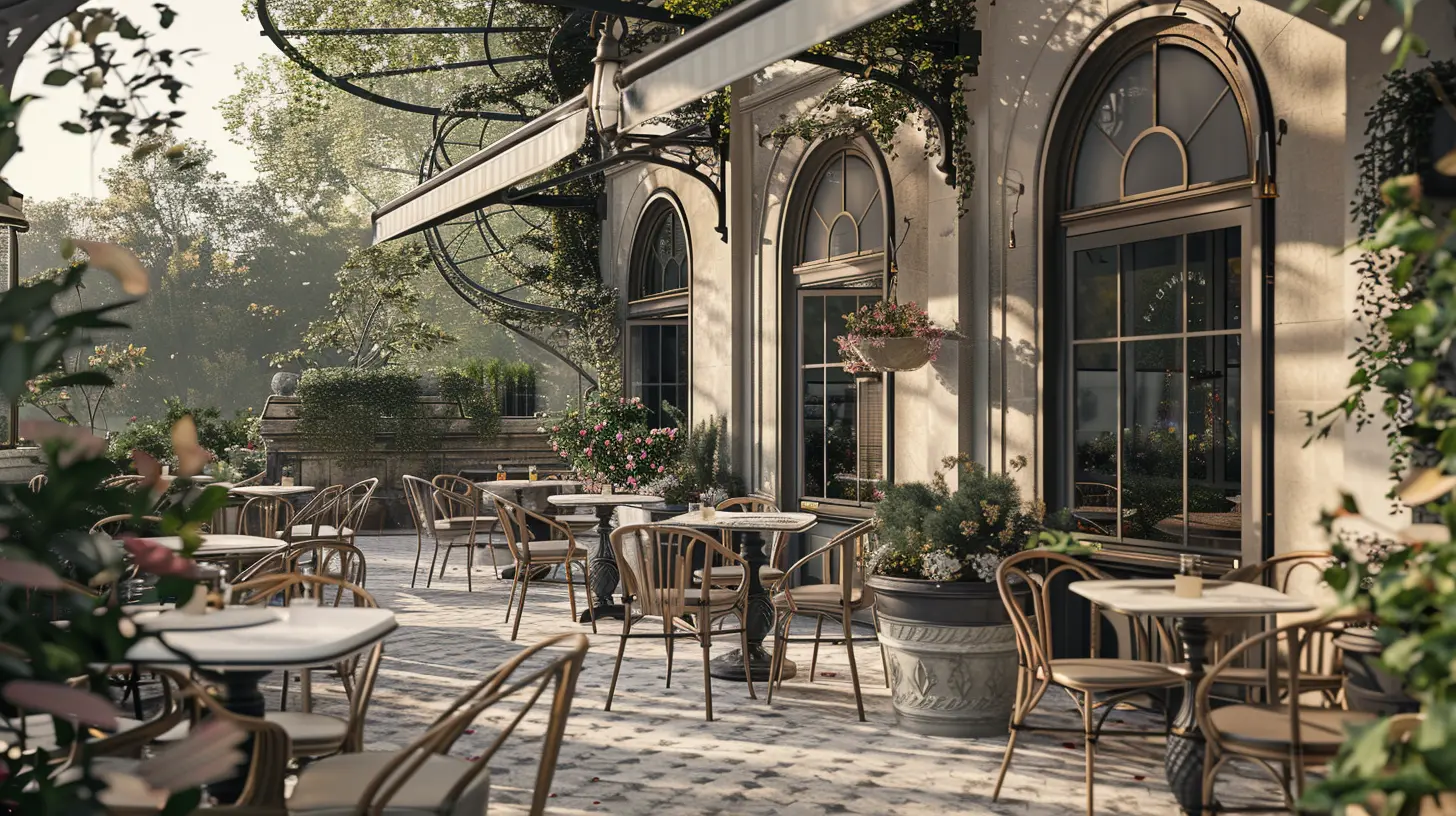 Là một phần không thể thiếu trong lối thiết kế nhà hàng Pháp. Đây là khoảng không gian dành cho thực khách ưa thích dùng bữa ngoài trời, thưởng thức cà phê, bánh ngọt và là góc tô điểm cho mặt tiền của nhà hàng. Khu vực này thường được thiết kế với không gian mở với nhiều cây xanh và chậu hoa, tạo cảm giác thoải mái và rộng rãi cho khách hàng.